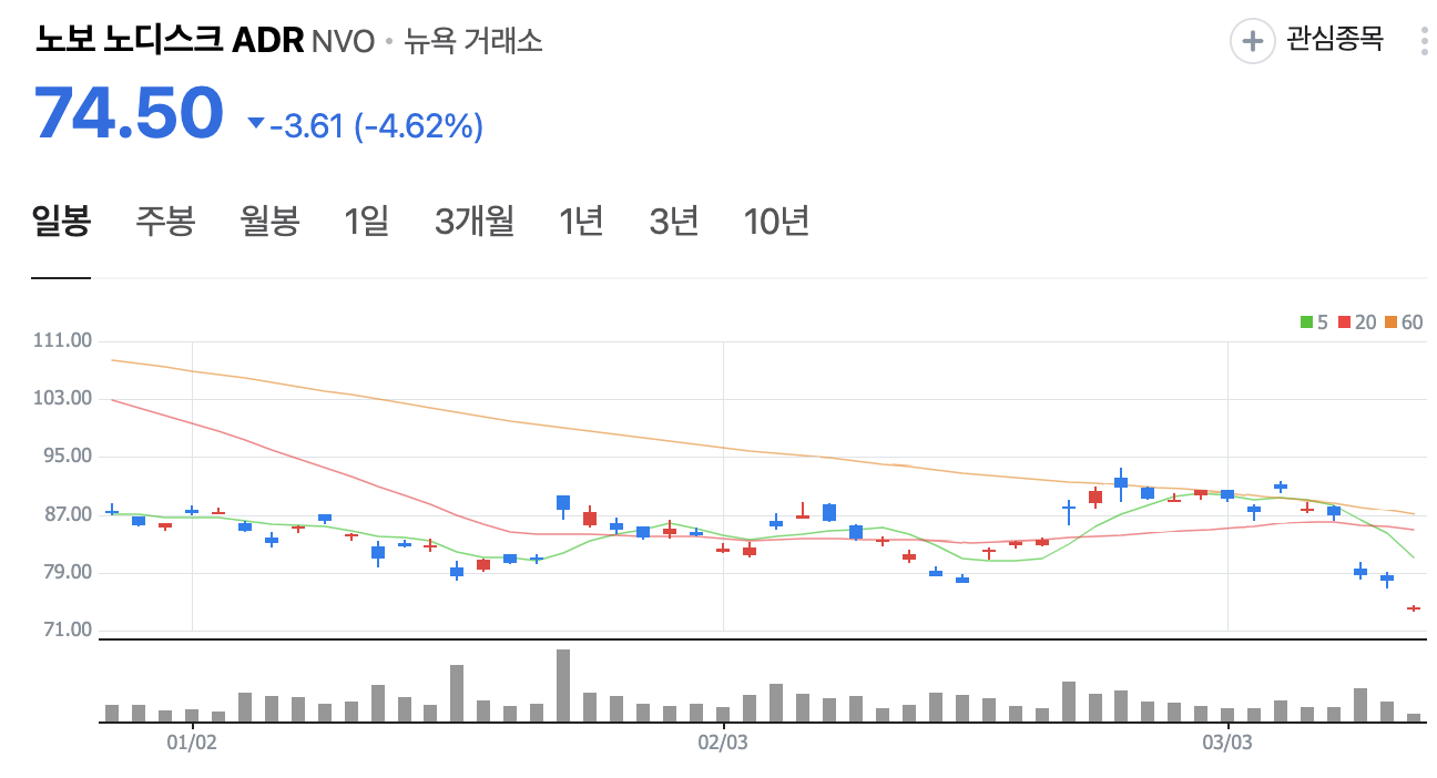 오늘은 로슈(Roche)의 비만치료제 개발 소식과 그로 인한 노보노디스크(Novo Nordisk)의 주가가 4% 하락중입니다.