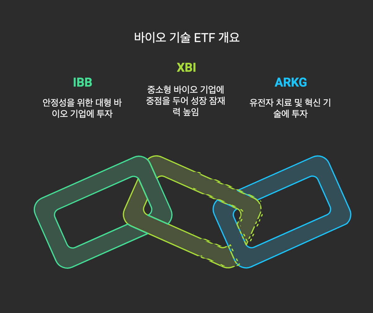 각 ETF는 고유한 투자 전략과 리스크 프로필을 가지고 있습니다. IBB는 안정성, XBI는 성장성, ARKG는 혁신성에 초점을 맞추고 있어 투자자의 선호도에 따라 선택할 수 있습니다. 바이오 산업의 특성상 높은 변동성을 보일 수 있으므로, 투자 결정 시 신중한 검토가 필요합니다