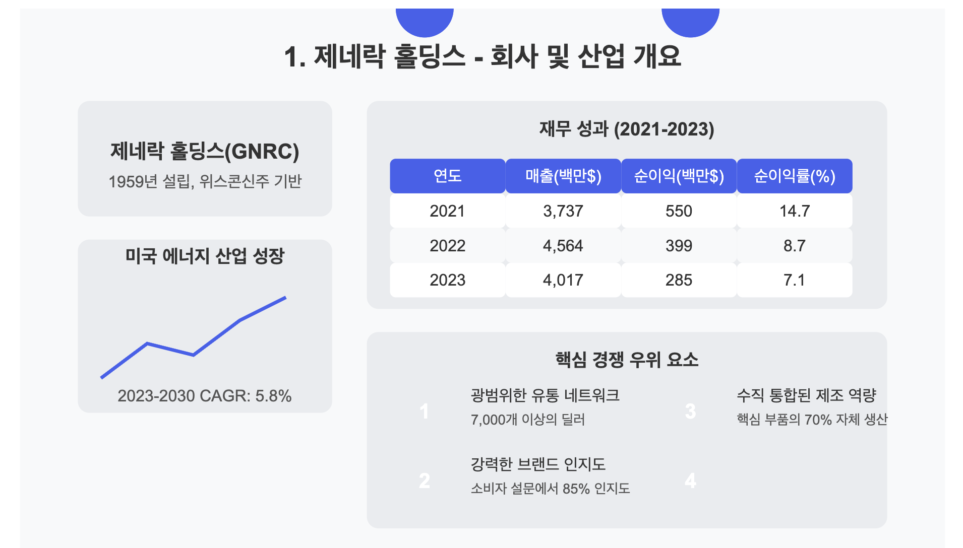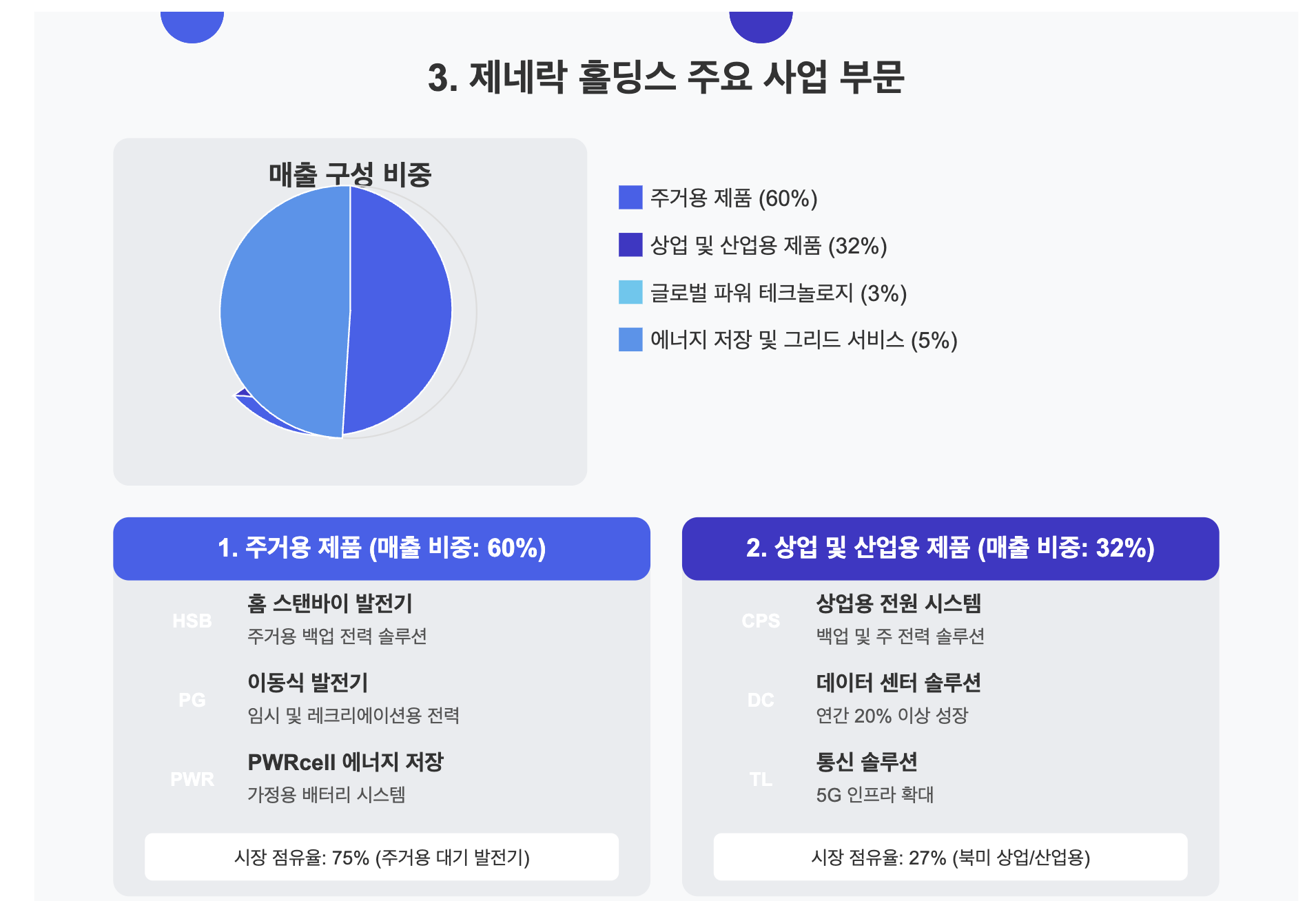 - 핵심 통계: 미국 내 약 500만 가구가 제네락 발전기를 사용 중이며, 잠재 시장은 약 7,000만 단독주택